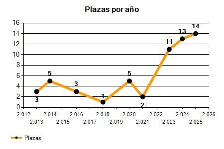 En los siguientes gráficos se puede ver la evolución del número de convocatorias y plazas convocadas para la profesión de Auxiliar administrativo en Teruel de los últimos años pudiéndose observar un crecimiento del 200,00% desde el año 2013 hasta el 2025 en número de convocatorias y un crecimiento del 366,67% en número de plazas convocadas.