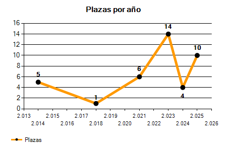 En los siguientes gráficos se puede ver la evolución del número de convocatorias y plazas convocadas para la profesión de Auxiliar de biblioteca en Málaga de los últimos años pudiéndose observar un crecimiento del 66,67% desde el año 2014 hasta el 2025 en número de convocatorias y un crecimiento del 100,00% en número de plazas convocadas.