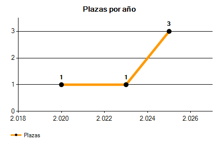 En los siguientes gráficos se puede ver la evolución del número de convocatorias y plazas convocadas para la profesión de Auxiliar de Empleo y Desarrollo Local en Granada de los últimos años pudiéndose observar un crecimiento del 200,00% desde el año 2020 hasta el 2025 en número de convocatorias y un crecimiento del 200,00% en número de plazas convocadas.