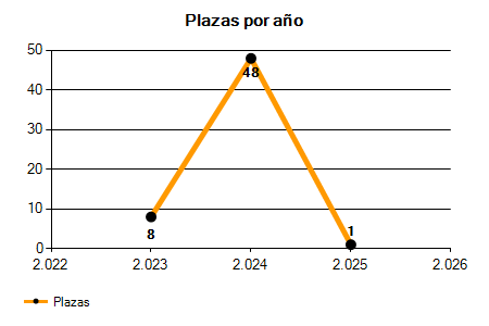 En los siguientes gráficos se puede ver la evolución del número de convocatorias y plazas convocadas para la profesión de Auxiliar de enfermería en Cáceres de los últimos años pudiéndose observar una caída del 50,00% desde el año 2023 hasta el 2025 en número de convocatorias y una caída del 87,50% en número de plazas convocadas.