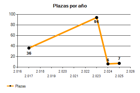 En los siguientes gráficos se puede ver la evolución del número de convocatorias y plazas convocadas para la profesión de Auxiliar de enfermería en Toledo de los últimos años pudiéndose observar una caída del 66,67% desde el año 2017 hasta el 2025 en número de convocatorias y una caída del 80,56% en número de plazas convocadas.