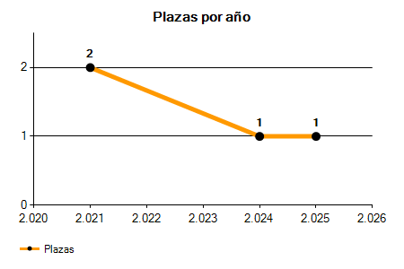 En los siguientes gráficos se puede ver la evolución del número de convocatorias y plazas convocadas para la profesión de Auxiliar de geriatría en Lugo de los últimos años pudiéndose observar un crecimiento y una caída del 0,00% desde el año 2021 hasta el 2025 en número de convocatorias y una caída del 50,00% en número de plazas convocadas.