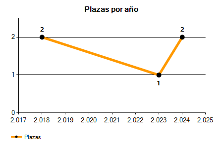 En los siguientes gráficos se puede ver la evolución del número de convocatorias y plazas convocadas para la profesión de Auxiliar de gestión informática en Asturias de los últimos años pudiéndose observar una caída del 100,00% desde el año 2018 hasta el 2025 en número de convocatorias y una caída del 100,00% en número de plazas convocadas.
