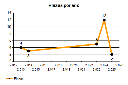 En los siguientes gráficos se puede ver la evolución del número de convocatorias y plazas convocadas para la profesión de Auxiliar de gestión informática en Girona de los últimos años pudiéndose observar una caída del 100,00% desde el año 2013 hasta el 2026 en número de convocatorias y una caída del 100,00% en número de plazas convocadas.