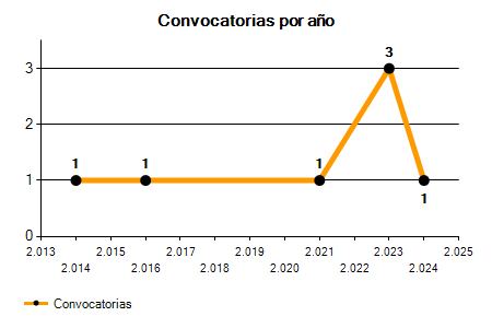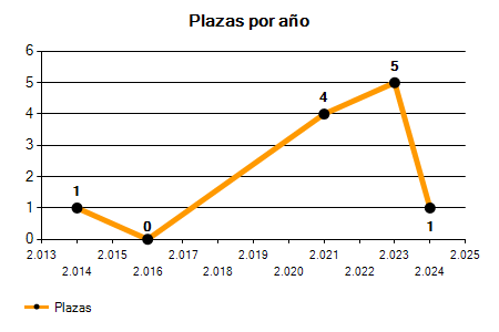 En los siguientes gráficos se puede ver la evolución del número de convocatorias y plazas convocadas para la profesión de Auxiliar de Turismo en Balears de los últimos años pudiéndose observar una caída del 100,00% desde el año 2014 hasta el 2025 en número de convocatorias y una caída del 100,00% en número de plazas convocadas.