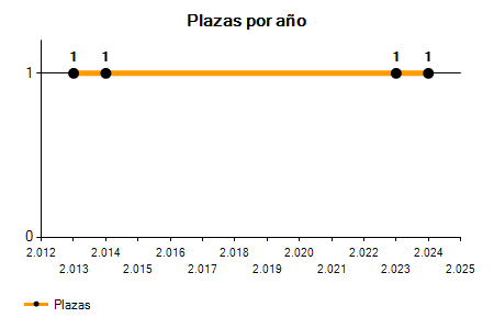 En los siguientes gráficos se puede ver la evolución del número de convocatorias y plazas convocadas para la profesión de Auxiliar de Turismo en Teruel de los últimos años pudiéndose observar una caída del 100,00% desde el año 2013 hasta el 2025 en número de convocatorias y una caída del 100,00% en número de plazas convocadas.