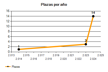 En los siguientes gráficos se puede ver la evolución del número de convocatorias y plazas convocadas para la profesión de Auxiliar de Turismo en Toledo de los últimos años pudiéndose observar una caída del 100,00% desde el año 2014 hasta el 2025 en número de convocatorias y una caída del 100,00% en número de plazas convocadas.