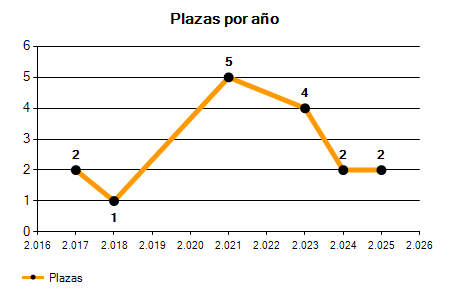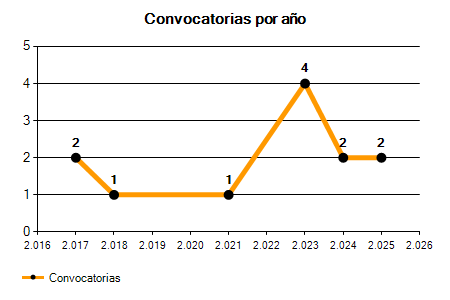 En los siguientes gráficos se puede ver la evolución del número de convocatorias y plazas convocadas para la profesión de Auxiliar notificador en Granada de los últimos años pudiéndose observar un crecimiento y una caída del 0,00% desde el año 2017 hasta el 2025 en número de convocatorias y un crecimiento y una caída del 0,00% en número de plazas convocadas.