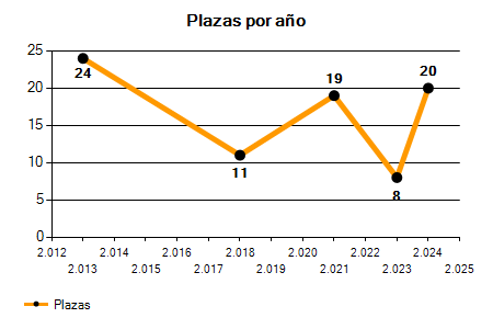 En los siguientes gráficos se puede ver la evolución del número de convocatorias y plazas convocadas para la profesión de Ayudante de oficio en Alicante de los últimos años pudiéndose observar una caída del 100,00% desde el año 2013 hasta el 2025 en número de convocatorias y una caída del 100,00% en número de plazas convocadas.
