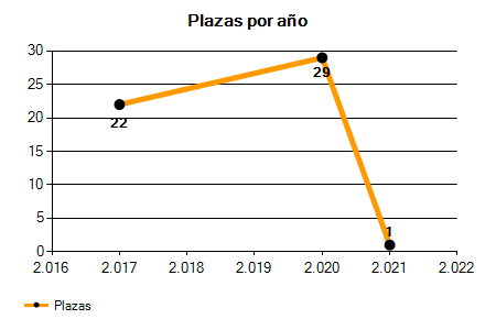 En los siguientes gráficos se puede ver la evolución del número de convocatorias y plazas convocadas para la profesión de Ayudantes Tributarios en Alicante de los últimos años pudiéndose observar una caída del 100,00% desde el año 2017 hasta el 2025 en número de convocatorias y una caída del 100,00% en número de plazas convocadas.