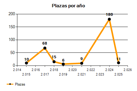 En los siguientes gráficos se puede ver la evolución del número de convocatorias y plazas convocadas para la profesión de Bombero en Almería de los últimos años pudiéndose observar un crecimiento del 200,00% desde el año 2015 hasta el 2025 en número de convocatorias y un crecimiento del 10,00% en número de plazas convocadas.
