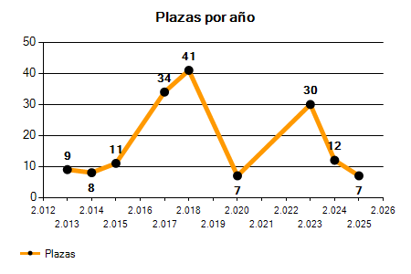 En los siguientes gráficos se puede ver la evolución del número de convocatorias y plazas convocadas para la profesión de Bombero en Balears de los últimos años pudiéndose observar un crecimiento del 50,00% desde el año 2013 hasta el 2025 en número de convocatorias y una caída del 22,22% en número de plazas convocadas.