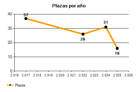En los siguientes gráficos se puede ver la evolución del número de convocatorias y plazas convocadas para la profesión de Bombero en Ciudad Real de los últimos años pudiéndose observar un crecimiento y una caída del 0,00% desde el año 2017 hasta el 2025 en número de convocatorias y una caída del 56,76% en número de plazas convocadas.