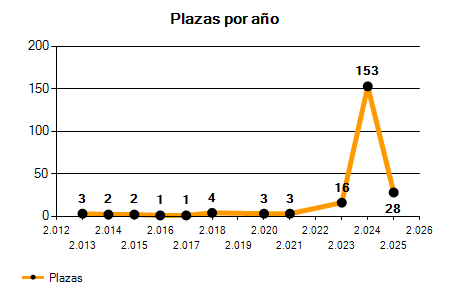 En los siguientes gráficos se puede ver la evolución del número de convocatorias y plazas convocadas para la profesión de Bombero en Huesca de los últimos años pudiéndose observar una caída del 33,33% desde el año 2013 hasta el 2025 en número de convocatorias y un crecimiento del 833,33% en número de plazas convocadas.