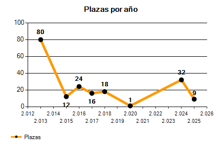 En los siguientes gráficos se puede ver la evolución del número de convocatorias y plazas convocadas para la profesión de Bombero en Jaén de los últimos años pudiéndose observar una caída del 62,50% desde el año 2013 hasta el 2025 en número de convocatorias y una caída del 88,75% en número de plazas convocadas.