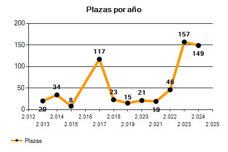 En los siguientes gráficos se puede ver la evolución del número de convocatorias y plazas convocadas para la profesión de Bombero en Sevilla de los últimos años pudiéndose observar una caída del 100,00% desde el año 2013 hasta el 2025 en número de convocatorias y una caída del 100,00% en número de plazas convocadas.