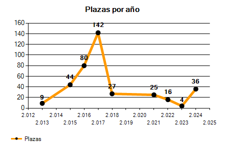 En los siguientes gráficos se puede ver la evolución del número de convocatorias y plazas convocadas para la profesión de Bombero en Zaragoza de los últimos años pudiéndose observar una caída del 100,00% desde el año 2013 hasta el 2025 en número de convocatorias y una caída del 100,00% en número de plazas convocadas.