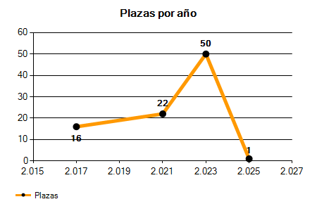 En los siguientes gráficos se puede ver la evolución del número de convocatorias y plazas convocadas para la profesión de Celador en Valencia de los últimos años pudiéndose observar un crecimiento y una caída del 0,00% desde el año 2017 hasta el 2025 en número de convocatorias y una caída del 93,75% en número de plazas convocadas.
