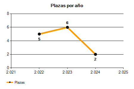 En los siguientes gráficos se puede ver la evolución del número de convocatorias y plazas convocadas para la profesión de Conserje de Instalaciones Deportivas en Valencia de los últimos años pudiéndose observar una caída del 100,00% desde el año 2022 hasta el 2025 en número de convocatorias y una caída del 100,00% en número de plazas convocadas.