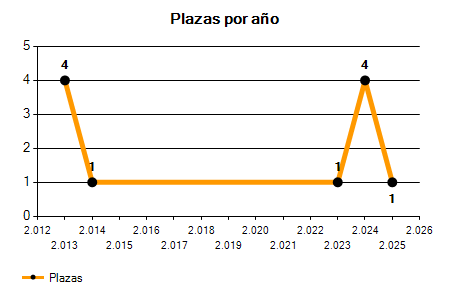 En los siguientes gráficos se puede ver la evolución del número de convocatorias y plazas convocadas para la profesión de Conserje en Navarra de los últimos años pudiéndose observar una caída del 75,00% desde el año 2013 hasta el 2025 en número de convocatorias y una caída del 75,00% en número de plazas convocadas.