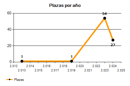 En los siguientes gráficos se puede ver la evolución del número de convocatorias y plazas convocadas para la profesión de Conserje en Vizcaya de los últimos años pudiéndose observar una caída del 100,00% desde el año 2013 hasta el 2025 en número de convocatorias y una caída del 100,00% en número de plazas convocadas.