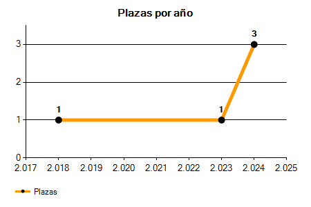 En los siguientes gráficos se puede ver la evolución del número de convocatorias y plazas convocadas para la profesión de Coordinador/a de deportes en Cuenca de los últimos años pudiéndose observar una caída del 100,00% desde el año 2018 hasta el 2025 en número de convocatorias y una caída del 100,00% en número de plazas convocadas.