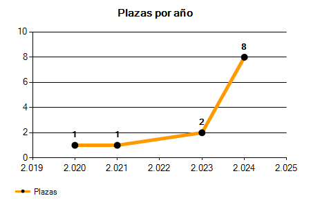 En los siguientes gráficos se puede ver la evolución del número de convocatorias y plazas convocadas para la profesión de Coordinador/a de deportes en Valencia de los últimos años pudiéndose observar una caída del 100,00% desde el año 2020 hasta el 2025 en número de convocatorias y una caída del 100,00% en número de plazas convocadas.