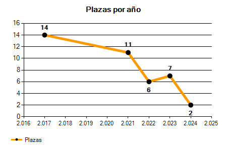 En los siguientes gráficos se puede ver la evolución del número de convocatorias y plazas convocadas para la profesión de Cuidador en Córdoba de los últimos años pudiéndose observar una caída del 100,00% desde el año 2017 hasta el 2025 en número de convocatorias y una caída del 100,00% en número de plazas convocadas.