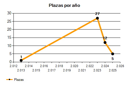 En los siguientes gráficos se puede ver la evolución del número de convocatorias y plazas convocadas para la profesión de Cuidador en Palmas,Las de los últimos años pudiéndose observar un crecimiento y una caída del 0,00% desde el año 2013 hasta el 2025 en número de convocatorias y un crecimiento del 400,00% en número de plazas convocadas.