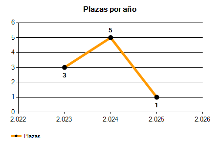 En los siguientes gráficos se puede ver la evolución del número de convocatorias y plazas convocadas para la profesión de Director de la Banda de Música en Badajoz de los últimos años pudiéndose observar una caída del 66,67% desde el año 2023 hasta el 2025 en número de convocatorias y una caída del 66,67% en número de plazas convocadas.