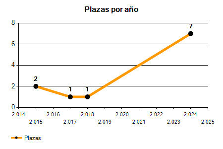 En los siguientes gráficos se puede ver la evolución del número de convocatorias y plazas convocadas para la profesión de Economista en Huelva de los últimos años pudiéndose observar una caída del 100,00% desde el año 2015 hasta el 2025 en número de convocatorias y una caída del 100,00% en número de plazas convocadas.