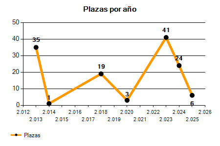 En los siguientes gráficos se puede ver la evolución del número de convocatorias y plazas convocadas para la profesión de Educador en Barcelona de los últimos años pudiéndose observar una caída del 57,14% desde el año 2013 hasta el 2025 en número de convocatorias y una caída del 82,86% en número de plazas convocadas.