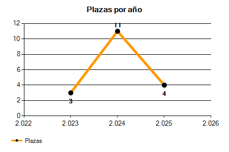 En los siguientes gráficos se puede ver la evolución del número de convocatorias y plazas convocadas para la profesión de Educador en Vizcaya de los últimos años pudiéndose observar una caída del 50,00% desde el año 2023 hasta el 2025 en número de convocatorias y un crecimiento del 33,33% en número de plazas convocadas.