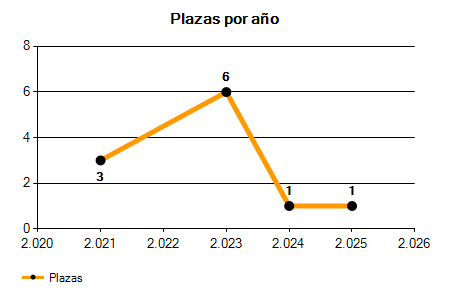 En los siguientes gráficos se puede ver la evolución del número de convocatorias y plazas convocadas para la profesión de Encargado/a General en Cádiz de los últimos años pudiéndose observar una caída del 50,00% desde el año 2021 hasta el 2025 en número de convocatorias y una caída del 66,67% en número de plazas convocadas.
