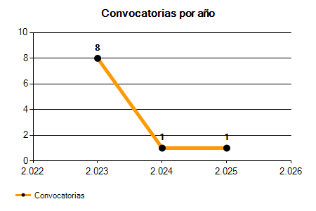 En los siguientes gráficos se puede ver la evolución del número de convocatorias y plazas convocadas para la profesión de Encargado/a General en Toledo de los últimos años pudiéndose observar una caída del 87,50% desde el año 2023 hasta el 2025 en número de convocatorias y una caída del 87,50% en número de plazas convocadas.