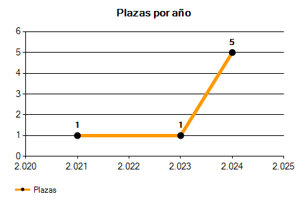 En los siguientes gráficos se puede ver la evolución del número de convocatorias y plazas convocadas para la profesión de Encargado de Mantenimiento y Obras en Albacete de los últimos años pudiéndose observar una caída del 100,00% desde el año 2021 hasta el 2025 en número de convocatorias y una caída del 100,00% en número de plazas convocadas.