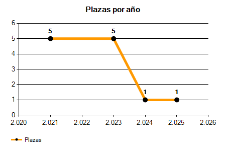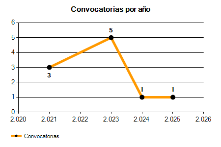 En los siguientes gráficos se puede ver la evolución del número de convocatorias y plazas convocadas para la profesión de Encargado de Mantenimiento y Obras en Córdoba de los últimos años pudiéndose observar una caída del 66,67% desde el año 2021 hasta el 2025 en número de convocatorias y una caída del 80,00% en número de plazas convocadas.
