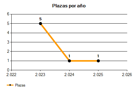 En los siguientes gráficos se puede ver la evolución del número de convocatorias y plazas convocadas para la profesión de Encargado de Mantenimiento y Obras en Vizcaya de los últimos años pudiéndose observar una caída del 80,00% desde el año 2023 hasta el 2025 en número de convocatorias y una caída del 80,00% en número de plazas convocadas.