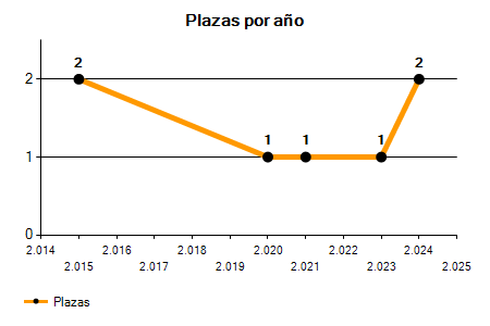 En los siguientes gráficos se puede ver la evolución del número de convocatorias y plazas convocadas para la profesión de Fontanero en Balears de los últimos años pudiéndose observar una caída del 100,00% desde el año 2015 hasta el 2025 en número de convocatorias y una caída del 100,00% en número de plazas convocadas.