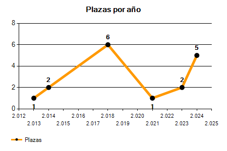 En los siguientes gráficos se puede ver la evolución del número de convocatorias y plazas convocadas para la profesión de Fontanero en Murcia de los últimos años pudiéndose observar una caída del 100,00% desde el año 2013 hasta el 2025 en número de convocatorias y una caída del 100,00% en número de plazas convocadas.