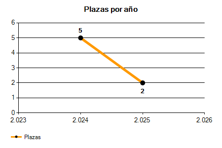 En los siguientes gráficos se puede ver la evolución del número de convocatorias y plazas convocadas para la profesión de Gestor Cultural en Cáceres de los últimos años pudiéndose observar una caída del 60,00% desde el año 2024 hasta el 2025 en número de convocatorias y una caída del 60,00% en número de plazas convocadas.