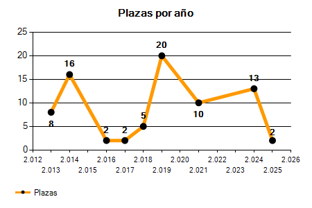 En los siguientes gráficos se puede ver la evolución del número de convocatorias y plazas convocadas para la profesión de Guardia urbana en Lleida de los últimos años pudiéndose observar un crecimiento y una caída del 0,00% desde el año 2013 hasta el 2025 en número de convocatorias y una caída del 75,00% en número de plazas convocadas.