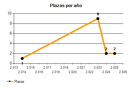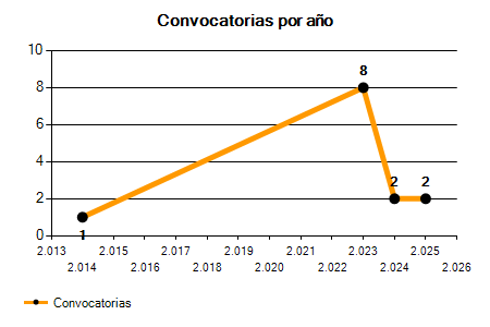 En los siguientes gráficos se puede ver la evolución del número de convocatorias y plazas convocadas para la profesión de Informador Turístico en Asturias de los últimos años pudiéndose observar un crecimiento del 100,00% desde el año 2014 hasta el 2025 en número de convocatorias y un crecimiento del 100,00% en número de plazas convocadas.