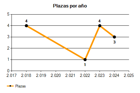 En los siguientes gráficos se puede ver la evolución del número de convocatorias y plazas convocadas para la profesión de Informador Turístico en Cáceres de los últimos años pudiéndose observar una caída del 100,00% desde el año 2018 hasta el 2025 en número de convocatorias y una caída del 100,00% en número de plazas convocadas.