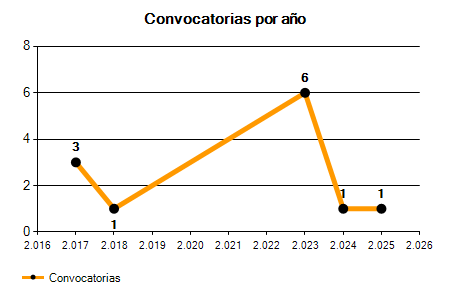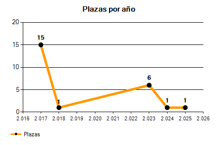 En los siguientes gráficos se puede ver la evolución del número de convocatorias y plazas convocadas para la profesión de Jefe de Sección en Badajoz de los últimos años pudiéndose observar una caída del 66,67% desde el año 2017 hasta el 2025 en número de convocatorias y una caída del 93,33% en número de plazas convocadas.