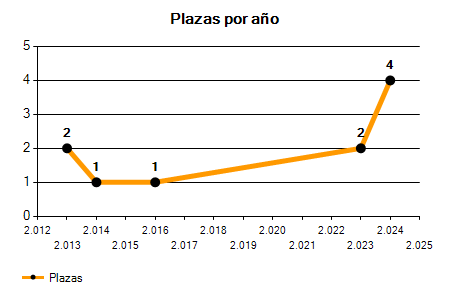 En los siguientes gráficos se puede ver la evolución del número de convocatorias y plazas convocadas para la profesión de Letrado en Barcelona de los últimos años pudiéndose observar una caída del 100,00% desde el año 2013 hasta el 2025 en número de convocatorias y una caída del 100,00% en número de plazas convocadas.