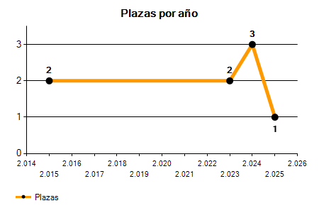 En los siguientes gráficos se puede ver la evolución del número de convocatorias y plazas convocadas para la profesión de Letrado en Huelva de los últimos años pudiéndose observar una caída del 50,00% desde el año 2015 hasta el 2025 en número de convocatorias y una caída del 50,00% en número de plazas convocadas.