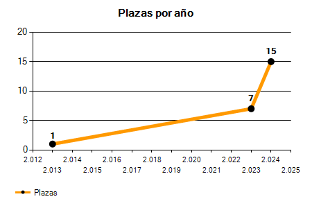 En los siguientes gráficos se puede ver la evolución del número de convocatorias y plazas convocadas para la profesión de Letrado en Palmas,Las de los últimos años pudiéndose observar una caída del 100,00% desde el año 2013 hasta el 2025 en número de convocatorias y una caída del 100,00% en número de plazas convocadas.