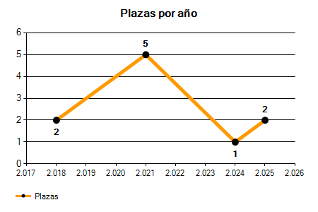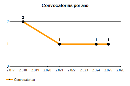 En los siguientes gráficos se puede ver la evolución del número de convocatorias y plazas convocadas para la profesión de Mecánico conductor en Cáceres de los últimos años pudiéndose observar una caída del 50,00% desde el año 2018 hasta el 2025 en número de convocatorias y un crecimiento y una caída del 0,00% en número de plazas convocadas.