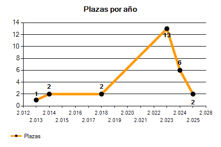 En los siguientes gráficos se puede ver la evolución del número de convocatorias y plazas convocadas para la profesión de Monitor en Albacete de los últimos años pudiéndose observar una caída del 50,00% desde el año 2013 hasta el 2025 en número de convocatorias y un crecimiento del 100,00% en número de plazas convocadas.